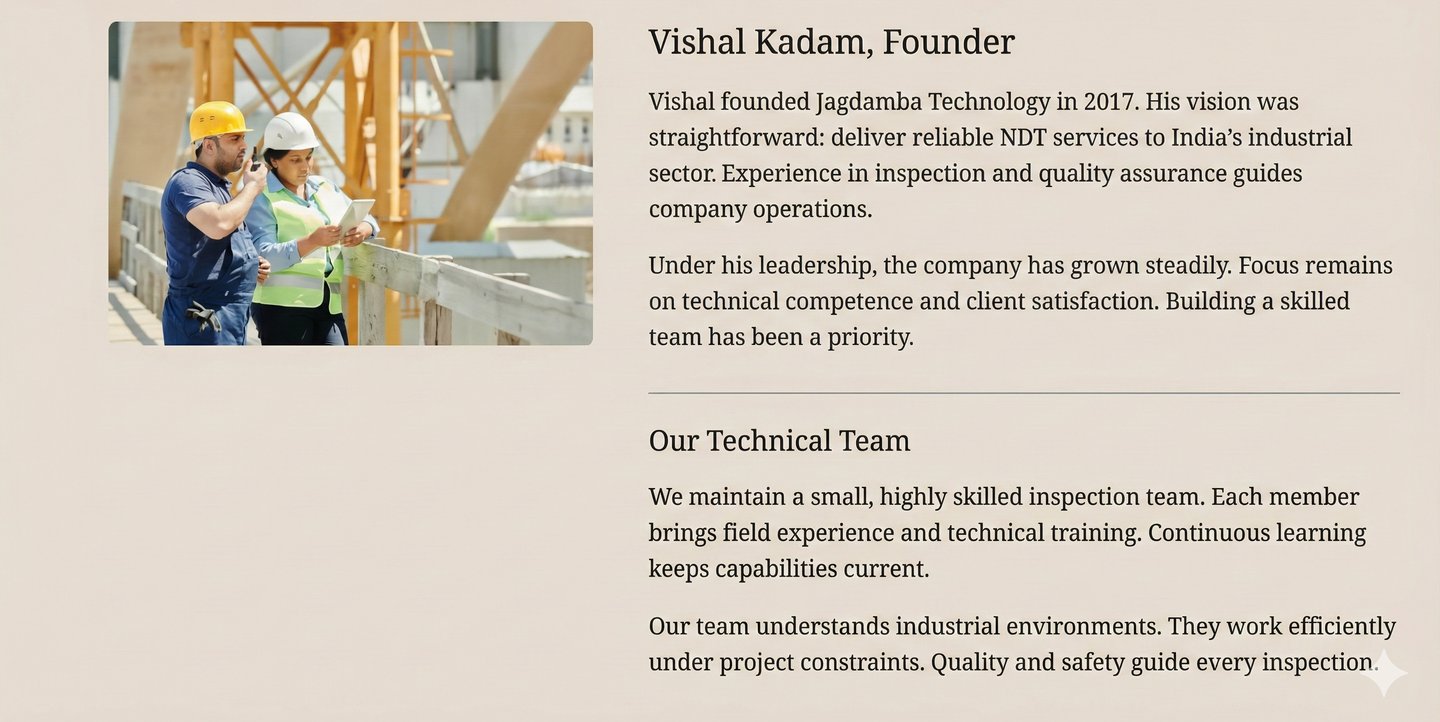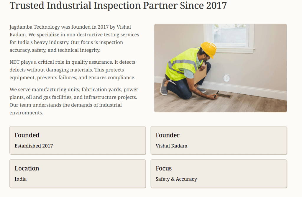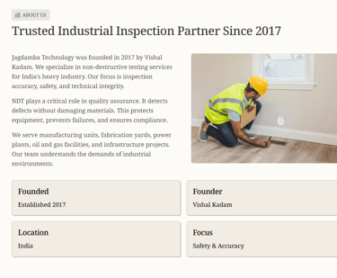 The team at Jagdamba Technology is highly skilled and reliable, ensuring our inspections are thorough and timely.