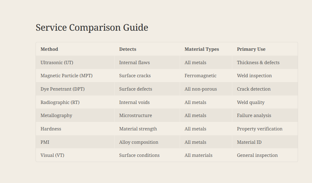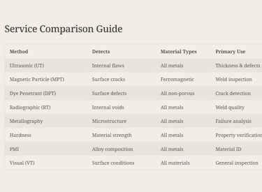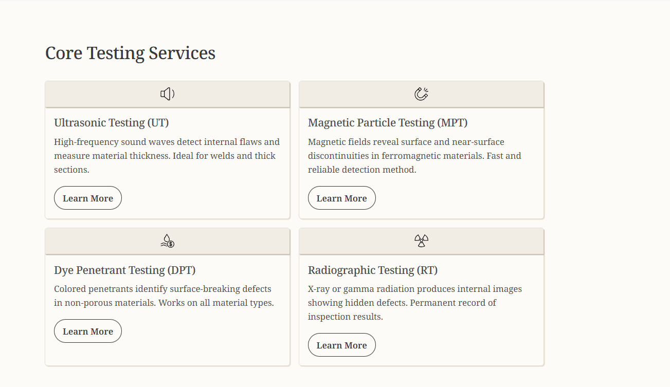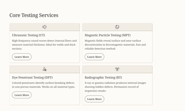 We offer ultrasonic testing, radiography, dye penetration, magnetic particle testing, and more for various industries.