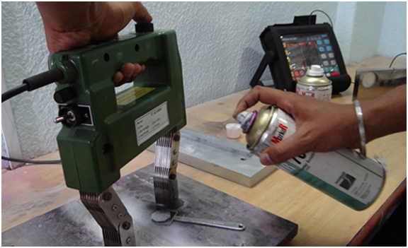 The component is magnetized using AC or DC magnetic yokes.Application of Magnetic Particles